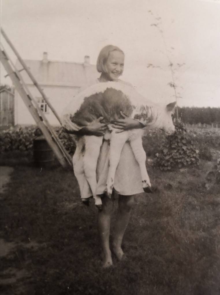 Kuvassa isän sisar pitelee vasikkaa täällä Joensuussa.