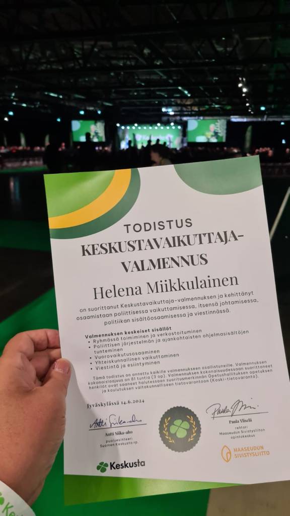 Entäs tämä sitten? Keskustavaikuttajavalmennus 2024 antoi konkreettisia eväitä vaikuttajan polulla. Suoritin myös valmennukseen liittyvät opintopisteet. Aivan huikea kurssi! Nyt on valtakunnallinen verkosto ja kaikkea. Kaiken kukkuraksi todistukset jakoi valtioneuvos Matti Taneli Vanhanen, Lepsämän paikallisyhdistyksen puheenjohtaja.