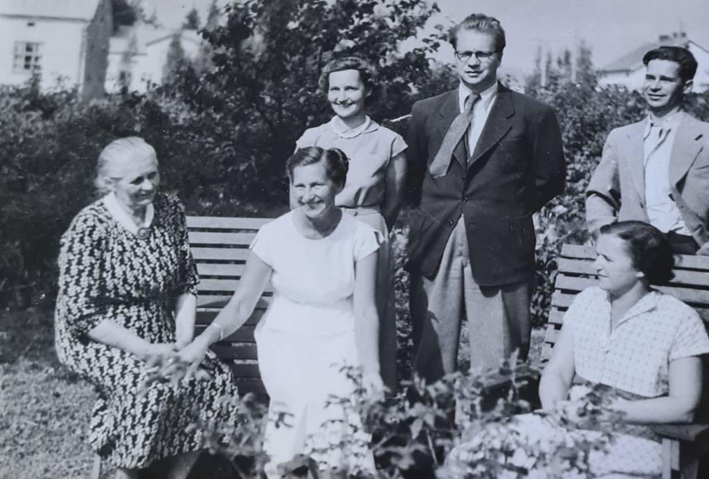 Mustavalkokuva: mummini Helena Kärkkäinen, o.s. Heino, syntyjään Hovatoff, ja isäni Pekka Kärkkäinen sisaruksineen kesäpäivänä puutarhassa koti-Joensuussa. Mummi oli kotiompelija, isä lakimies, setä insinööri, kaksi tädeistä opettajia ja yksi oli sairaanhoitaja. Mummi piti äitien rintaneulaa, jossa lyyrat komeilivat lasten ylioppilaslakkien lukumäärän mukaan, ei tosin juuri tässä kuvassa. Mummilla oli siis viisi lyyraa. Ihan kelpo suoritus leskiäidiltä! Ja hyvä JYK, Joensuu!