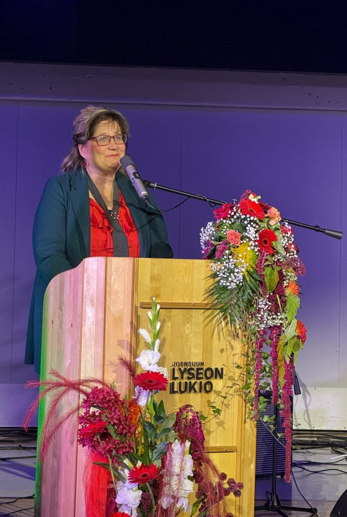 Aikaani käytän myös yhdistys- ja järjestöaktiivina. On suuri kunnia saada toimia oman entisen opinahjon perinneyhdistyksessä: olen Joensuun Lyseo-seura ry:n puheenjohtaja. Kuvassa tuon yhdistyksemme tervehdyksen koulun iltamiin 2023. Aivan tämän sivun alussa nähty kuva puolestaan on Lyseon lukion 160-vuotisjuhlista, jossa pidin Lyseo-seuran puheenvuoron. Mikä ilo!