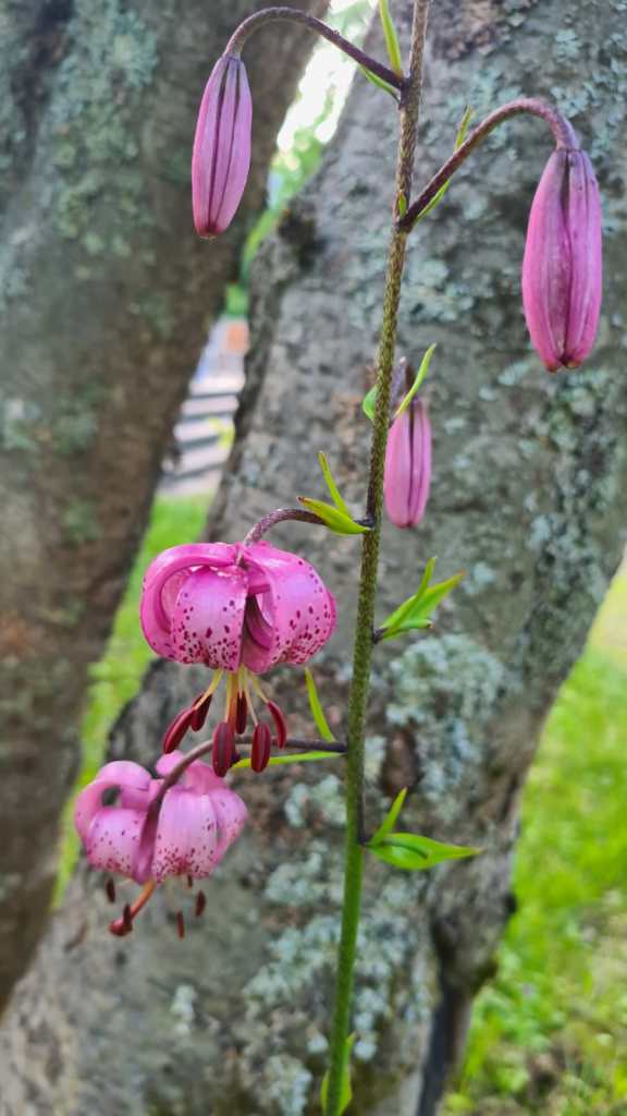 Kuvan koristeellinen kasvi vanhan pihapihlajan juurella on nimeltään varjolilja. Se on siihen itsekseen ilmestynyt ja olen hyvin iloinen sen olemassaolosta. Olen myös opastanut isäntää, että varoo sitä ruohonleikkauspuuhissa, että saamme jatkossakin nauttia sen kauneudesta. Varjolilja on vanhojen pihojen monivuotisia kasveja.
